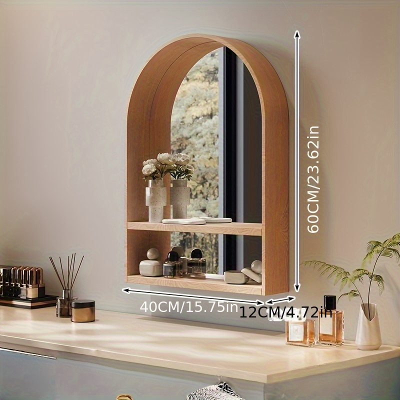 Solid Beech Wood Wall-Mounted Makeup Vanity Mirror with Integrated Storage Shelves